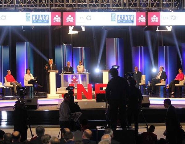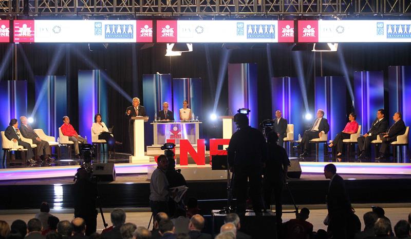 Los diez candidatos a la Presidencia de Perú participan en un debate convocado por el JNE a una semana de las elecciones generales que determinarán a las autoridades del país para el período 2016-2021. Foto: EFE