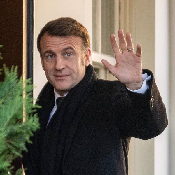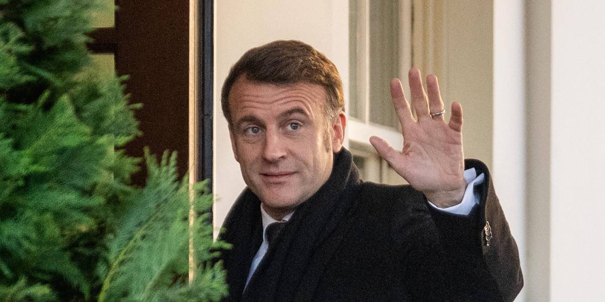 El presidente francés, Emmanuel Macron, saluda a la prensa a su llegada a la Casa Blanca en Washington, DC, el 24 de febrero de 2025.( )
