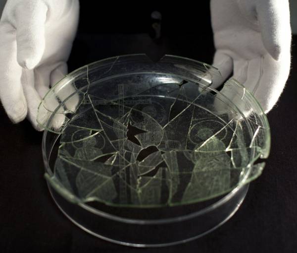 Una vez pegados, los fragmentos dieron luz a lo que los expertos consideran una patena, un plato destinado a contener el pan consagrado para la eucaristía, de vidrio verdoso de 22 cm de diámetro y unos 4 cm de profundidad, que pudo ser reconstruido a más del 80%.
