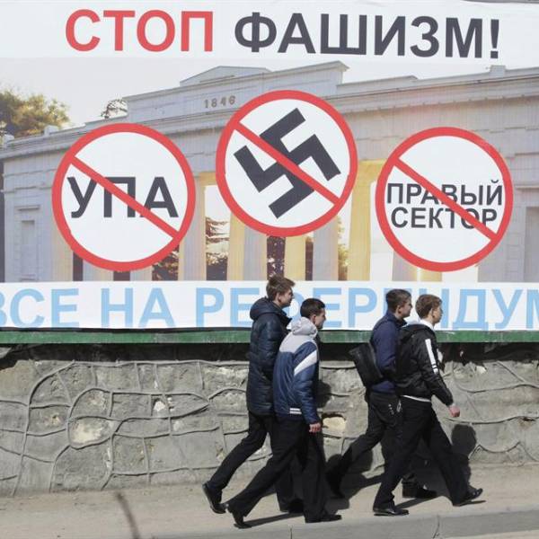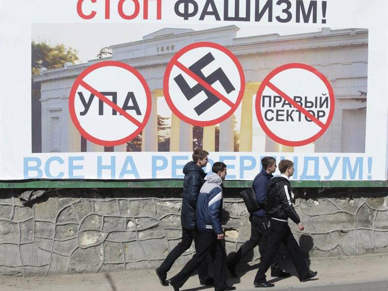 CRIMEA.- Varios viandantes pasan delante de un cartel que anima a la población a votar en el referéndum sobre Crimea. Foto: EFE.