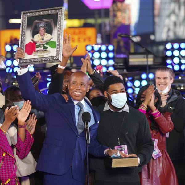 Con el confeti todavía sobrevolando Times Square, Adams recitó el juramento al cargo. La juez Sylvia O. Hinds-Radix, de la división de apelaciones de la Corte Suprema estatal, tomó juramento a Adams, que colocó una mano sobre una biblia familiar y con la otra sostuvo una imagen de su madre, Dorothy, fallecida en 2020.