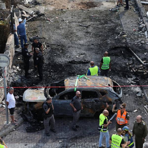 Los equipos de emergencia israelíes trabajan en el lugar de un ataque con misiles contra un barrio residencial en Kiryat Bialik.( )