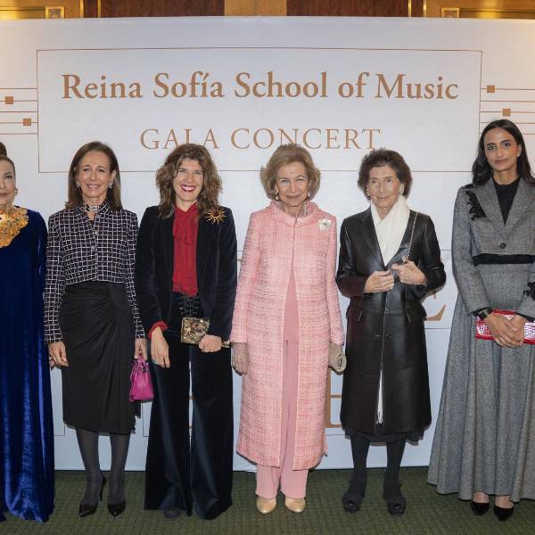 La función contó entre sus espectadores con la reina Sofía, que, vestida con un elegante conjunto de color rosa, contempló el concierto desde uno de los balcones del teatro y acompañada de la presidenta de la escuela, Paloma O’Shea.