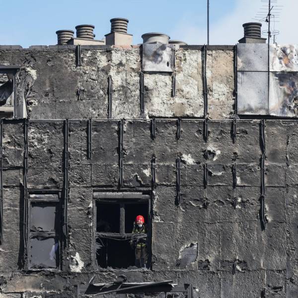 Un bombero revisa el interior de uno de los edificios afectados después de que un incendio arrasara dos bloques de apartamentos.( )