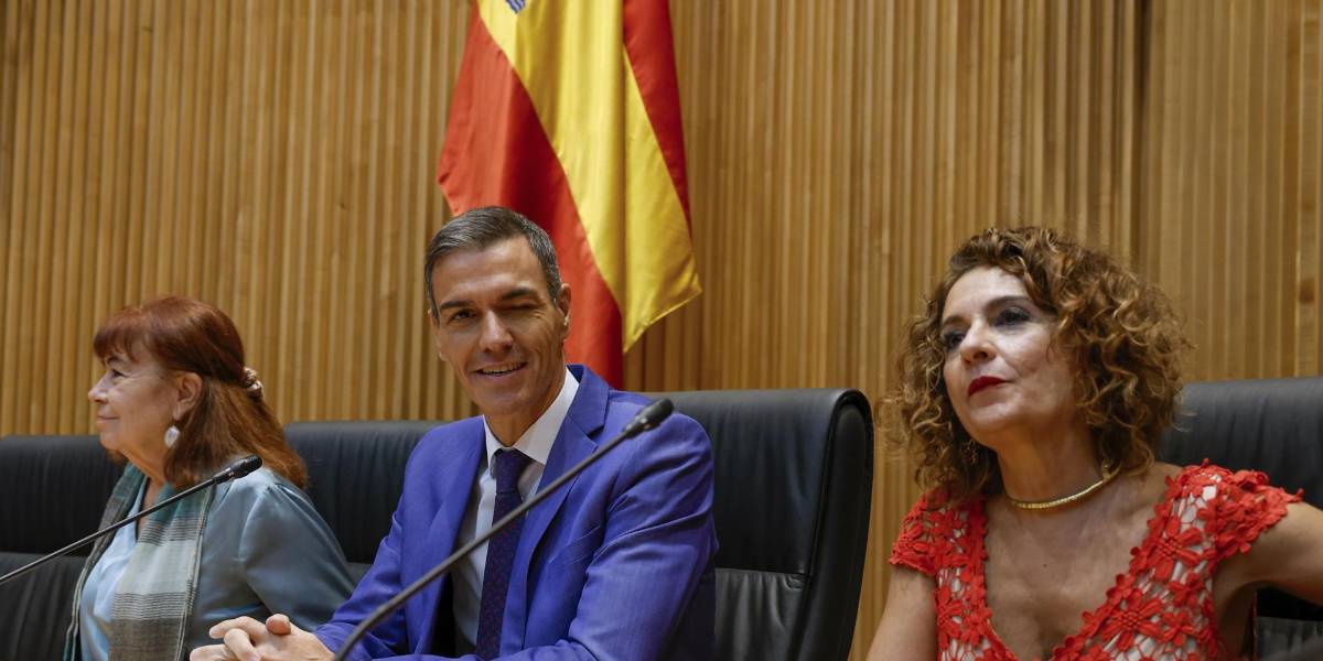 El presidente del Gobierno, Pedro Sánchez junto a la presidenta del PSOE, Cristina Narbona y la vicesecretaria general, María Jesús Montero, preside la reunión interparlamentaria del Grupo Parlamentario Socialista, este lunes en el Congreso( )