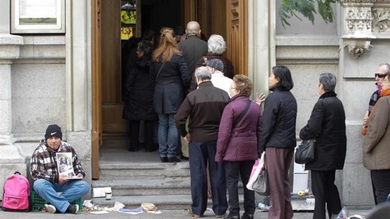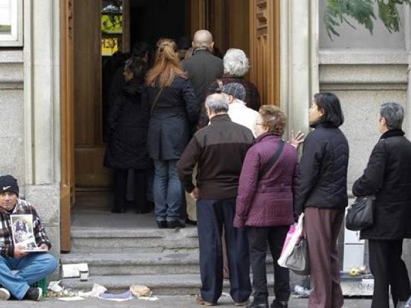 Ciudadanos españoles haciendo fila para ingresar a una iglesia, ante la mirada de un 'sin hogar'.