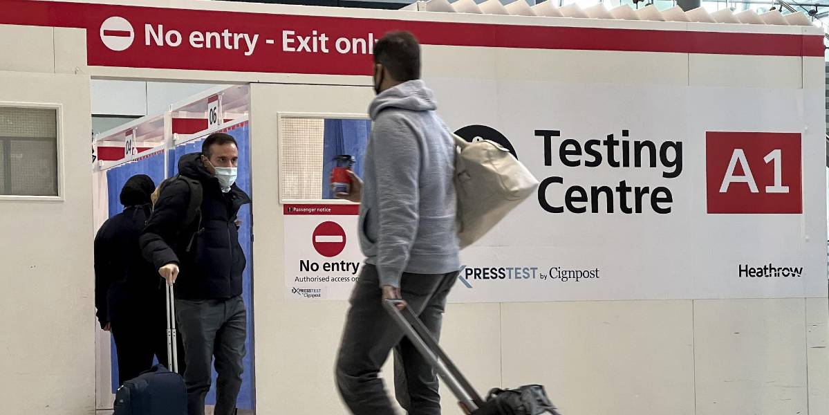 Foto referencial de un pasajero saliendo de un módulo de pruebas de COVID-19 en el aeropuerto de Heathrow en Londres.( )