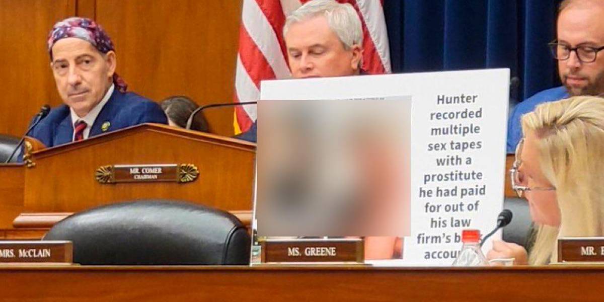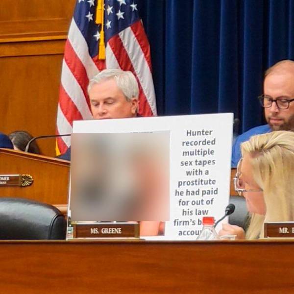En pequeños carteles, la legisladora mostró fotos sexuales de Hunter Biden que procederían del disco duro portátil que aparentemente pertenecía al acusado. Los rostros de las personas implicadas fueron censurados, menos el de Hunter.