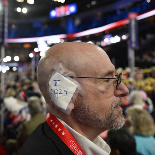 Un delegado republicano usa una gasa en su oreja, como la que Trump uso luego del atentado. ( )