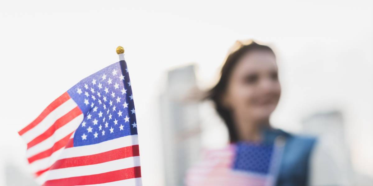 Imagen referencial de mujer sosteniendo la bandera de EE.UU. ( )