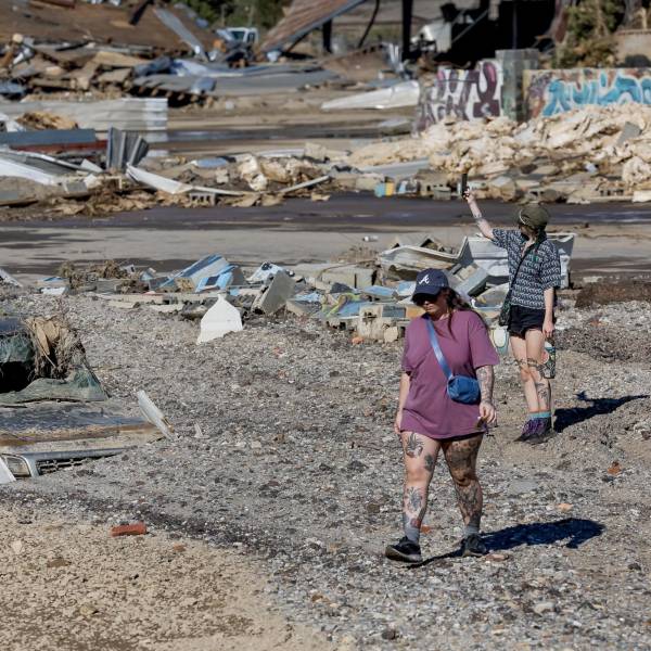 Personas caminando junto a un vehículo afectado luego de las inundaciones provocadas por la tormenta tropical Helene en Ashevill.( )