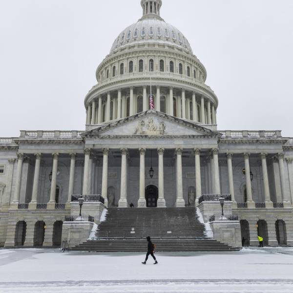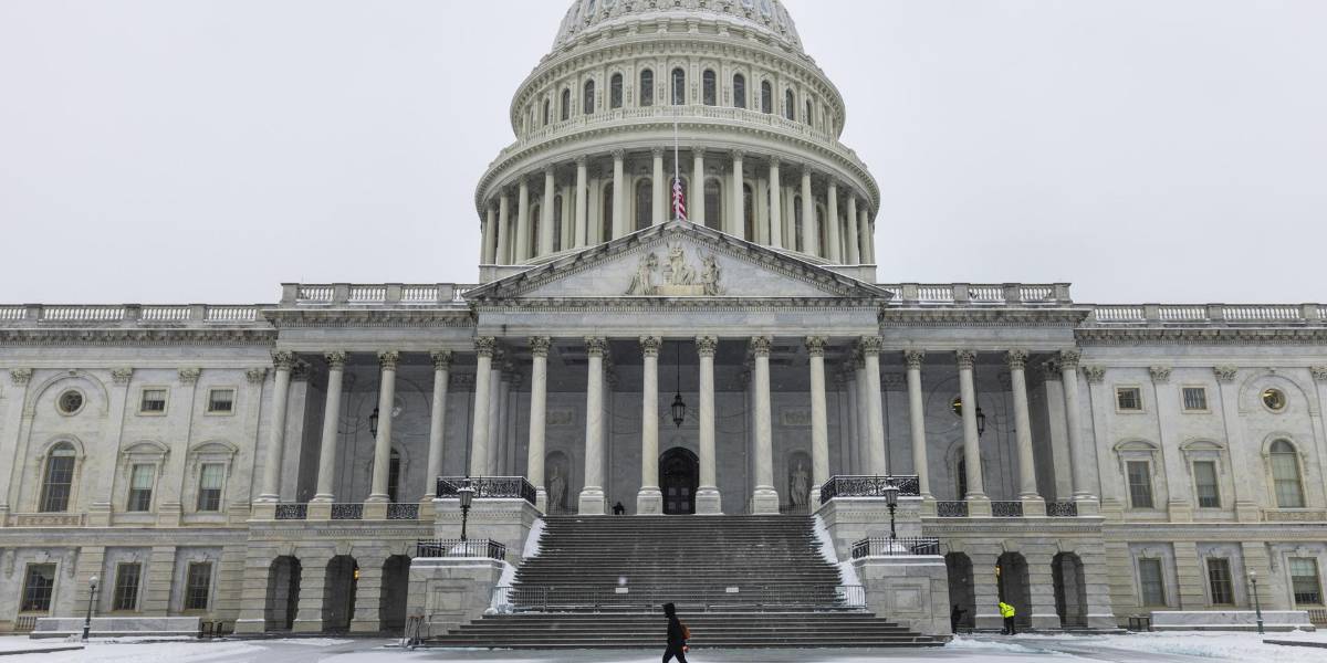 Una persona camina frente al Capitolio de Estados Unidos mientras los legisladores se reúnen para certificar la victoria electoral del presidente electo, Donald Trump, en Washington, DC.( )