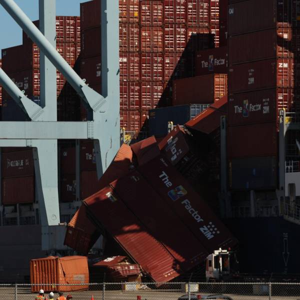 Una escena caótica se desarrolló en el puerto de Long Beach cuando docenas de contenedores cayeron de un buque de carga.