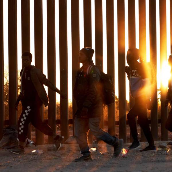 Fotografía de archivo de migrantes que caminan junto al muro en la frontera de EE.UU, y México, en Lukeville, Arizona, EE. UU.( )