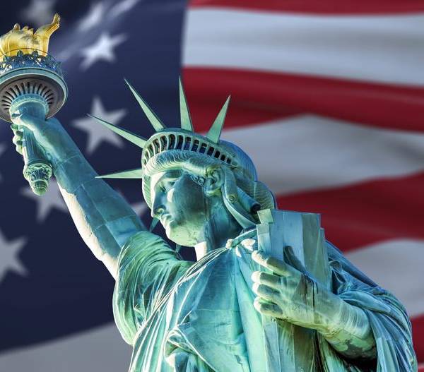 Imagen referencial de la estatua de la libertad frente a la bandera estadounidense.( )