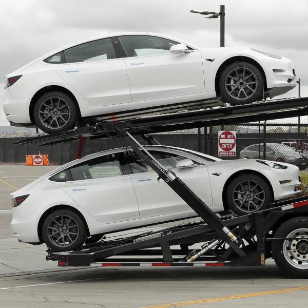 Fotografía de archivo de un camión transportador que lleva vehículos eléctricos mientras sale de la fábrica en Fremont, California, EE. UU., el 12 de mayo de 2020.( )