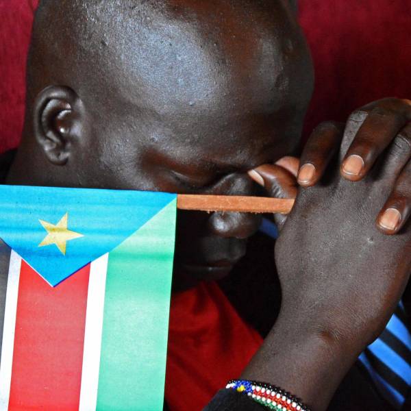 Un hombre sostiene una bandera de Sudán del Sur y reza.( )