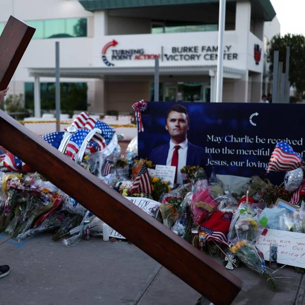Un hombre carga una gran cruz cerca de un monumento improvisado en honor a Charlie Kirk, fundador de Turning Point USA, frente a la sede de Turning Point USA en Phoenix, Arizona, el 12 de septiembre de 2025.( )