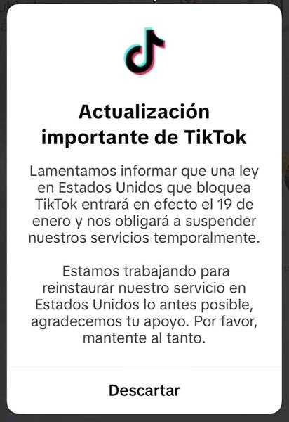 El aviso sobre el cierre de la aplicación apareció aproximadamente una hora y media antes de la entrada en vigor de la ley, a las 00H01 del domingo, hora del Este de Estados Unidos. Algunos usuarios intentaron desinstalar y volver a descargar la aplicación, pero esta ya fue retirada de App Store.