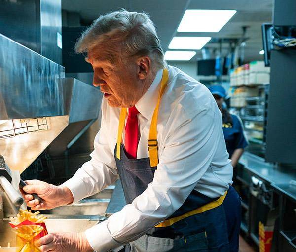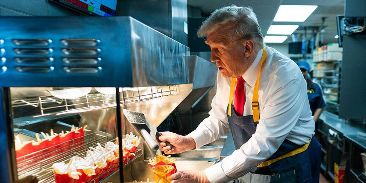 El republicano hizo una parada en un local de la franquicia a las afueras de Filadelfia, donde se puso un delantal y pasó unos minutos cocinando patatas fritas junto a los empleados y repartiéndolas a través de la ventanilla para recoger pedidos desde el vehículo.