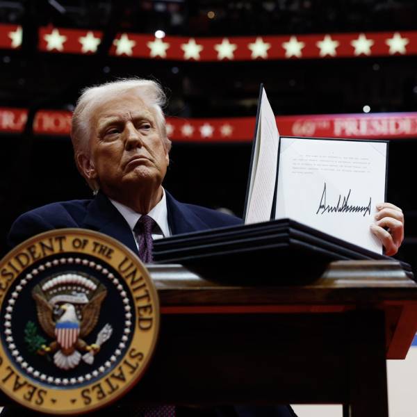 El presidente de Estados Unidos, Donald Trump, sostiene una orden ejecutiva después de firmarla durante un evento inaugural en el Capital One Arena en Washington, DC.( )