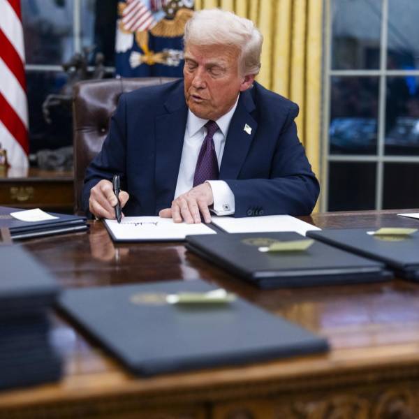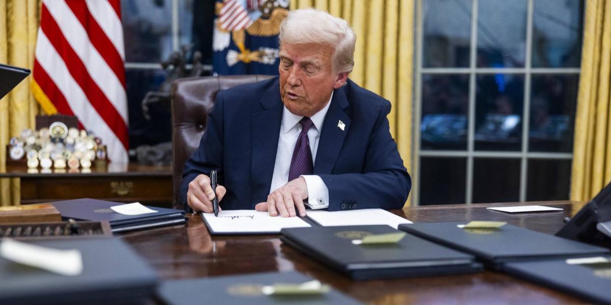 El presidente de Estados Unidos, Donald Trump, firma numerosas órdenes ejecutivas en el primer día de su presidencia en la Oficina Oval de la Casa Blanca en Washington, DC, EE.UU., el 20 de enero de 2025. ( )