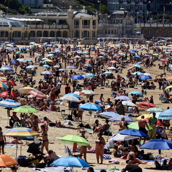 Numerosas personas en la playa de La Concha, en San Sebastián, este domingo, jornada en la que buena parte de España se encuentra en alerta amarilla por las altas temperaturas. ( )