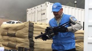 En La Elvira, un delegado de la misión de la ONU -a cargo de este proceso- recibió el lote de armas y comprobó que estuvieran sin municiones, antes de identificarlas y colocarlas en depósitos.