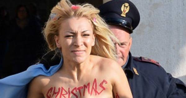 Inna Shevchenko, de 23 años, corrió con el torso desnudo hacia la plaza con las palabras "la Navidad está cancelada" escritas en pintura roja sobre su pecho.
