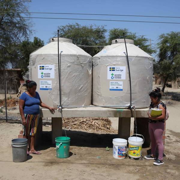 Mujeres llenan baldes con agua de los bidones instalados por Acción contra el Hambre, el 6 de septiembre de 2023 en el asentamiento humano de Mocará, departamento de Piura (Perú).( )
