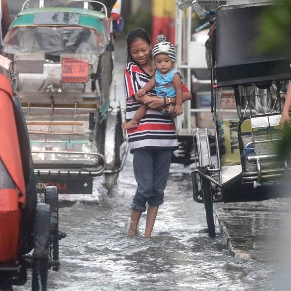 Una madre con su hijo en medio de las inundaciones en la ciudad de Malabon, Filipinas que fueron causadas por el supertifón Doksuri. ( )