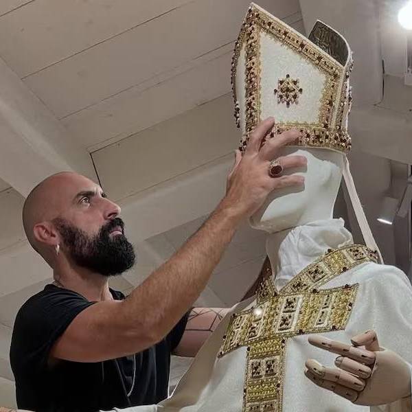 Filippo Sorcinelli no solo es conocido por su trabajo con la Santa Sede, sino también por su capacidad para involucrar los cinco sentidos en sus creaciones. El diseño de sus vestimentas está impregnado de aromas, como el incienso, que evocan la espiritualidad y la liturgia de la Iglesia.