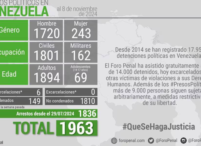 Las protestas estallaron luego de que el Consejo Nacional Electoral declarara ganador a Maduro sin revelar resultados oficiales. Las manifestaciones, en las que se exigía transparencia y justicia electoral, derivaron en la detención de más de 1 963, incluyendo a 69 adolescentes, según cifras de la ONG Foro Penal.