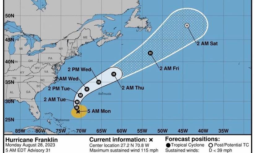 Franklin, que la semana pasada tocó tierra como tormenta tropical en el sur de República Dominicana, donde descargó lluvias intensas que provocaron inundaciones y desbordamientos, estaba esta mañana a 635 km al norte de la isla Gran Turca y a 810 km al suroeste de Bermuda.