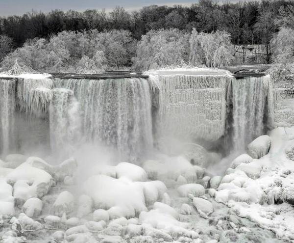 Las bajas temperaturas de -22°C y el vórtice polar transforman las icónicas cataratas en un paisaje helado.