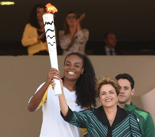 Rousseff, de 68 años, fue la encargada de pasar el fuego olímpico a Fabiana Caldino, bicampeona olímpica de voley, que descendió la rampa del Palacio de Planalto para comenzar a correr con la antorcha en alto por las calles de Brasilia, rodeada por miles de personas que la alentaban.