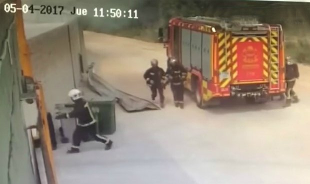 En las imágenes de YouTube se observa, a un grupo de hombres llegar al lugar para sofocar un incendio ocurrido en una fábrica de residuos del municipio de Arganda del Rey. Al estar en la puerta del citado lugar, los bomberos fueron sorprendidos por la explosión y fueron tumbados al suelo.
