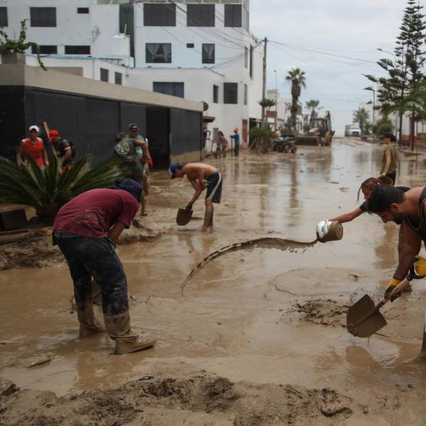 Fotografía de archivo, tomada el 15 de marzo, en la que se registró a un grupo de personas al ayudar al remover el lodo de una calle anegada por las fuertes lluvias, en el balneario de Punta Hermosa, al sur de Lima (Perú). EFE/Paolo Aguilar( )