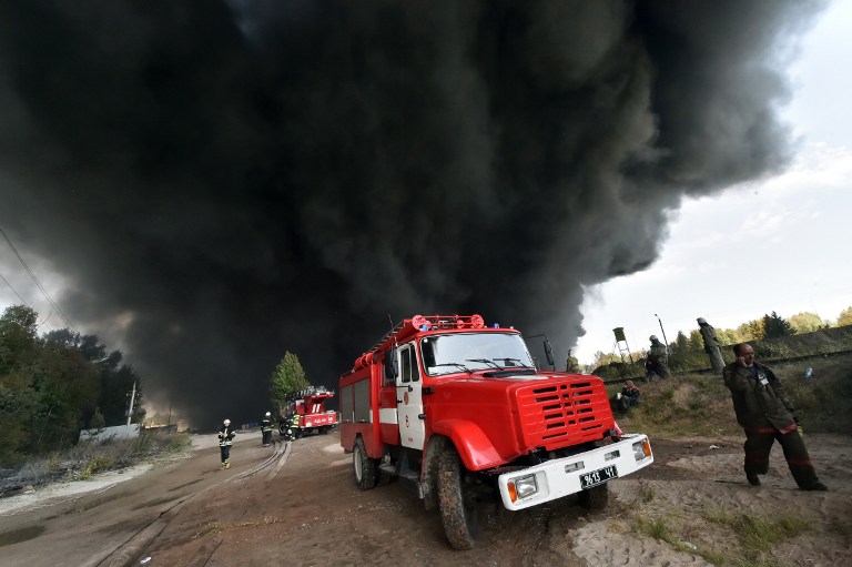 Un gigantesco incendio en un depósito de petróleo cerca de Kiev, que causó la muerte de un civil y la desaparición de tres bomberos, obligó a evacuar a los civiles de la zona cubierta por una espesa humareda negra.