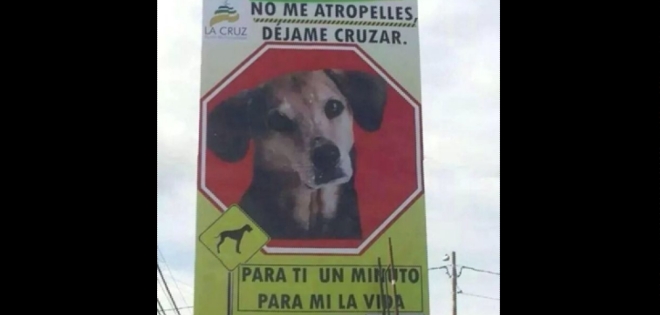 Gigantezco cartel pide a conductores respetar a perros que cruzan la calle