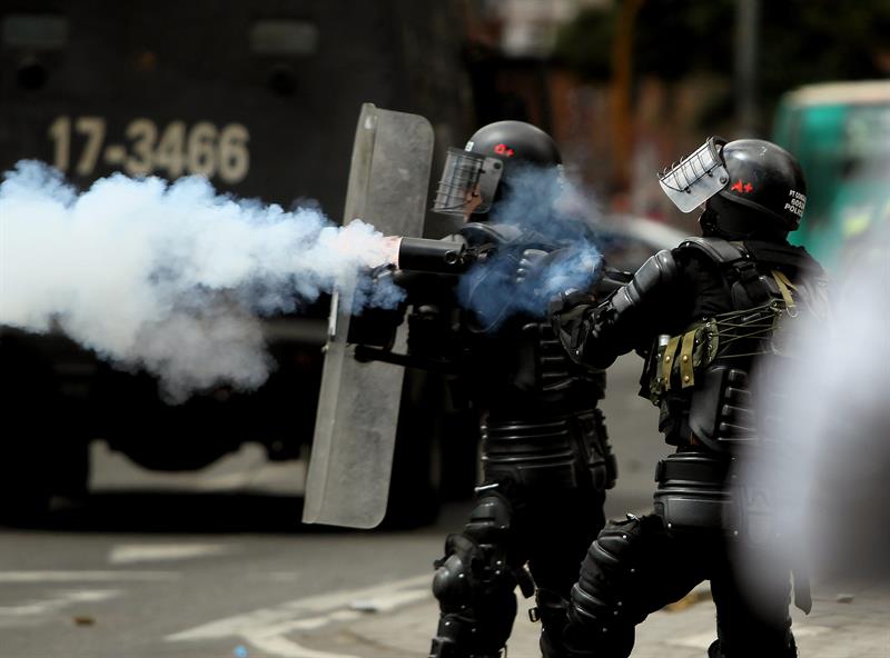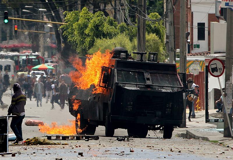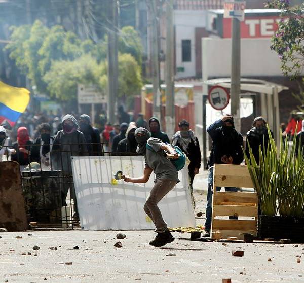 COLOMBIA.- Un grupo de estudiantes se enfrentan a miembros del Escuadrón Móvil Anti Disturbios en apoyo al paro agrario. Fotos: EFE -