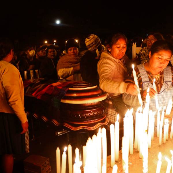 Una mujer llorosa puso su mano sobre un ataúd de madera rodeado de flores mientras preguntaba: “¿Esto es democracia? Así matando como si fuera cualquier cosa”. Otra lloraba y rezaba en quechua sobre el féretro de Omar Calle, que estaba cubierto con la bandera nacional boliviana y la “wiphala”, que representa a los pueblos indígenas.