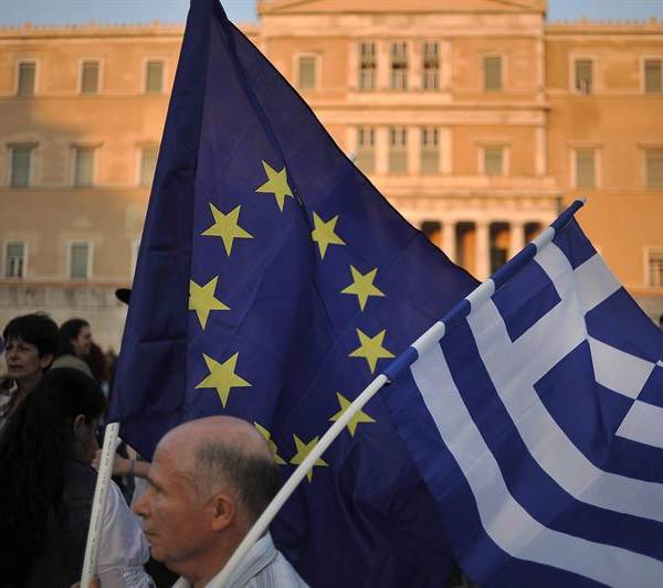 GRECIA.- Un manifestante ondea una bandera de la Unión Europea y de Grecia durante una manifestación a favor de la zona euro