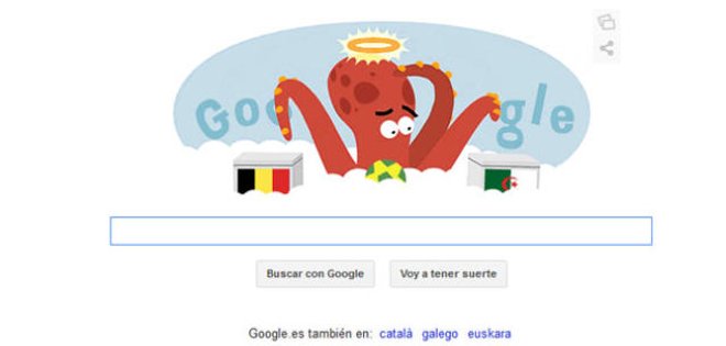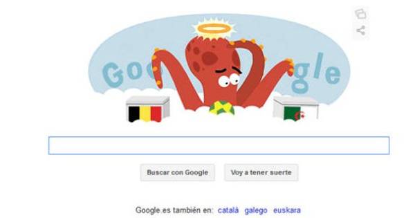 El buscador recuerda a Paul, fallecido poco después del Mundial que ganó España, en una predicción para el partido Bélgica-Argelia de este martes a las 11H00, en el marco del Mundial Brasil 2014. Google lo muestra de manera simpática con aspecto "divino", pero con cara de indecisión sobre el partido de esta jornada.