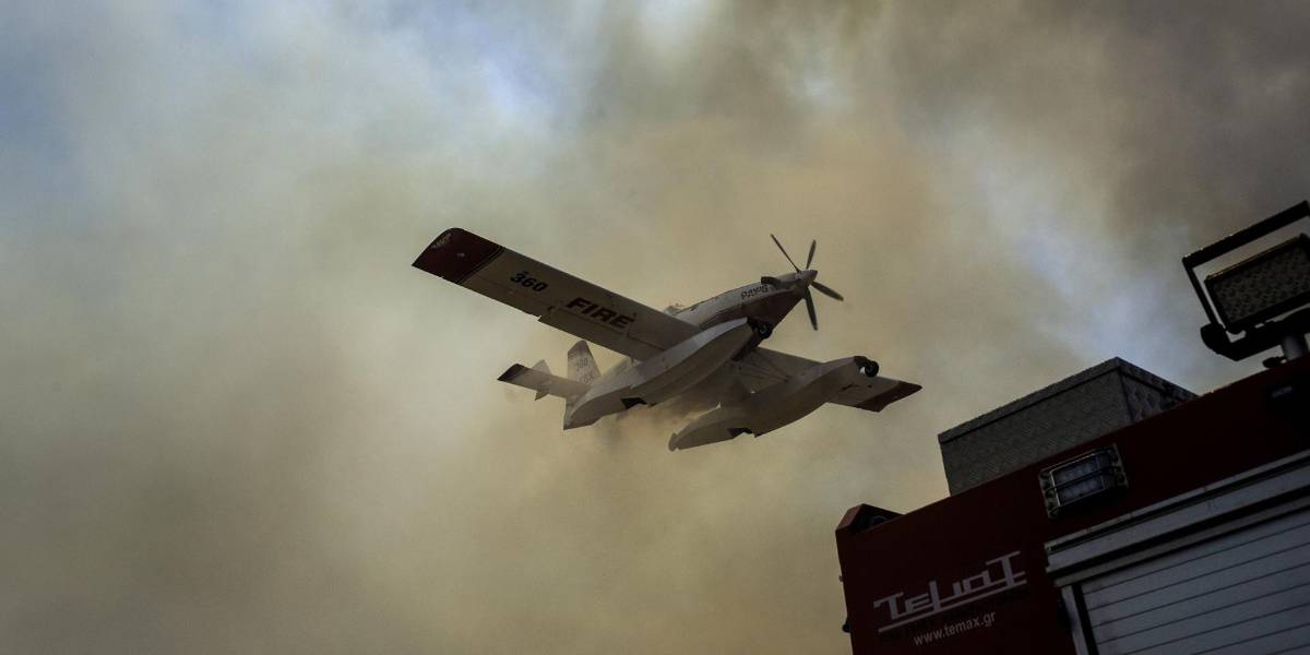 Un avión lanza agua en el incendio de Velestino, Grecia.( )