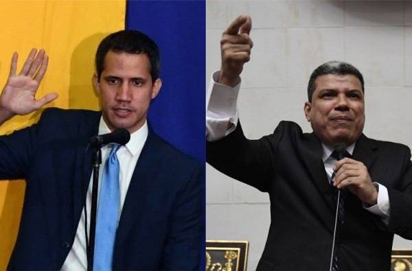 Juan Guaidó y Luis Parra juramentando como presidentes de la Asamblea Nacional de Venezuela en dos sesiones diferentes. AFP
