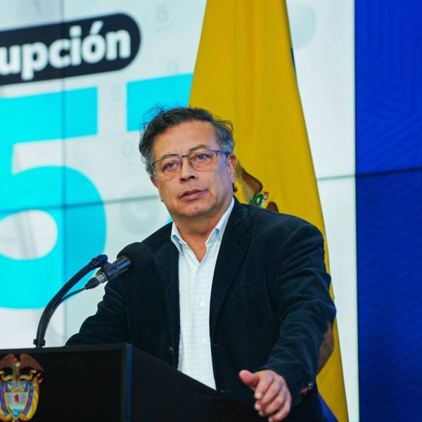 Fotografía cedida por la oficina de prensa de la Presidencia de Colombia del mandatario colombiano, Gustavo Petro, durante el acto de presentación de la Línea Anticorrupción 157, el martes en Bogotá (Colombia).( )