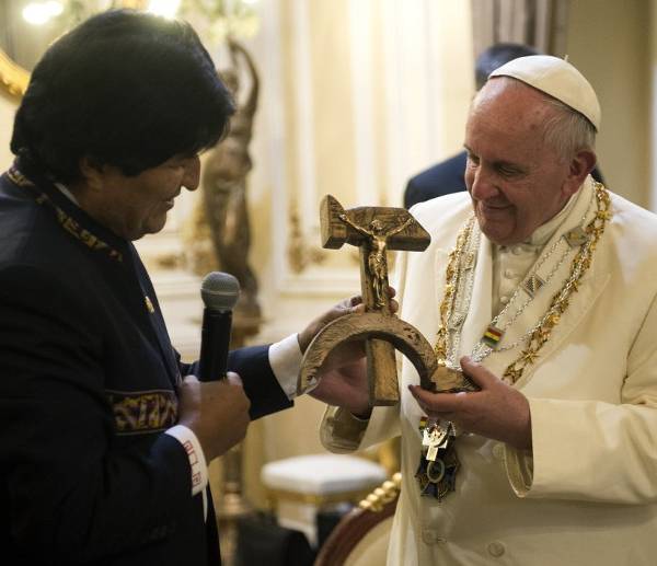 Lea: MORALES OBSEQUIA A FRANCISCO UN CRISTO CRUCIFICADO SOBRE LA HOZ Y EL MARTILLO