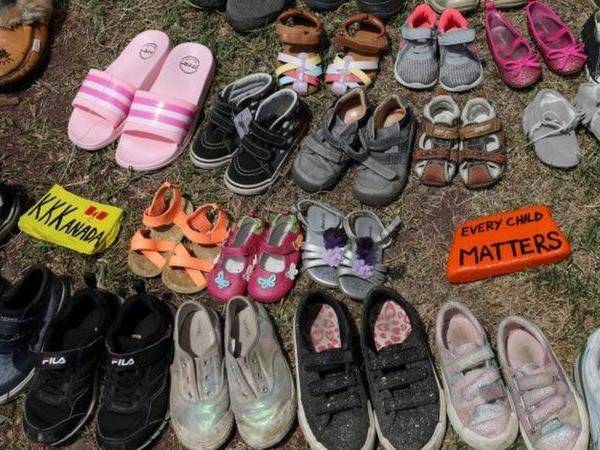 En semanas recientes, la gente dejó calzado de niños en monumentos conmemorativos para honrar a los que murieron en las escuelas indígenas de Canadá.( )
