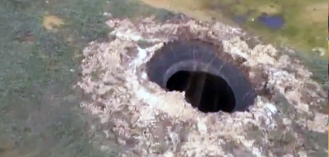 Un impresionante foso ha sido descubierto por los pilotos de unos helicópteros que sobrevolaban la península de Yamal (Siberia Occidental). Debido a su gran tamaño y forma, puede ser que el cráter se formase por el impacto de un meteorito.